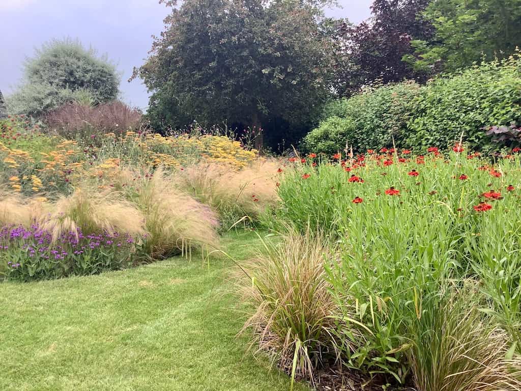 Photo of a garden in summer with borders full of colourful plants. A mown lawn pathway runs away from the camera on the left hand side